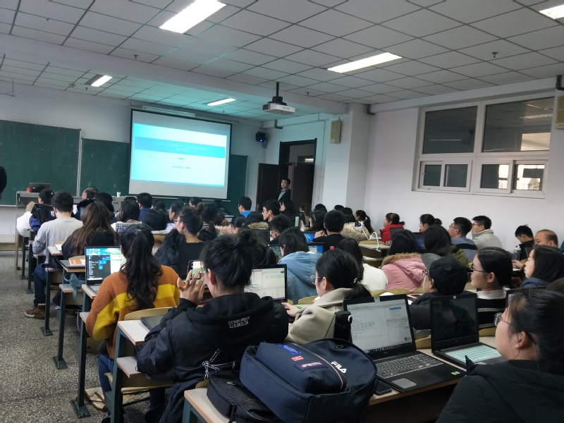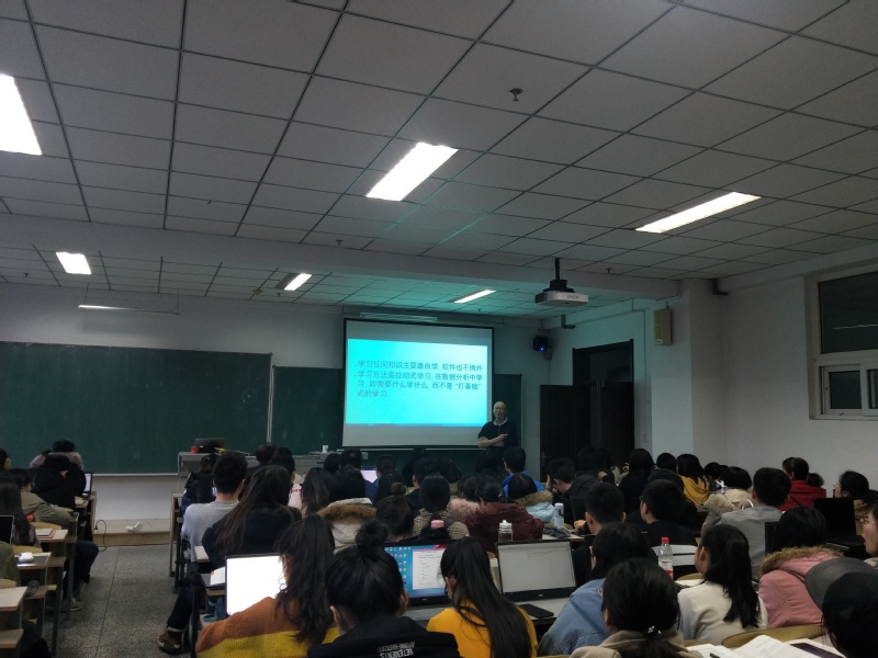 报告会中,吴喜之教授首先引用了数据科学的先驱Vincent Granville的一句话“没有统计的数据科学是可能的,甚至更理想”和乔布斯的“学习编程教你如何思考”为大家介绍Python软件,并且吴喜之教授从具体数据说明Python是现在最流行、最实用的软件。吴喜之教授说,学习任何知识主要靠自学,软件也不例外。学习是拉动式学习,在数据分析中学习,而不是“打基础”式的学习。接下来,吴喜之教授从基础的Python知识为大家讲解,耐心的讲解Python用于数据处理方面的知识。吴喜之教授高屋建瓴,结合实例,生动形象的为同学们展示了数据科学的魅力,同时结合自身的求学经历,围绕着数据科学软件的学习与科学思维的培养等内容与大家展开了热烈的讨论和交流,为同学们今后从事数理统计研究提供了更多思路。