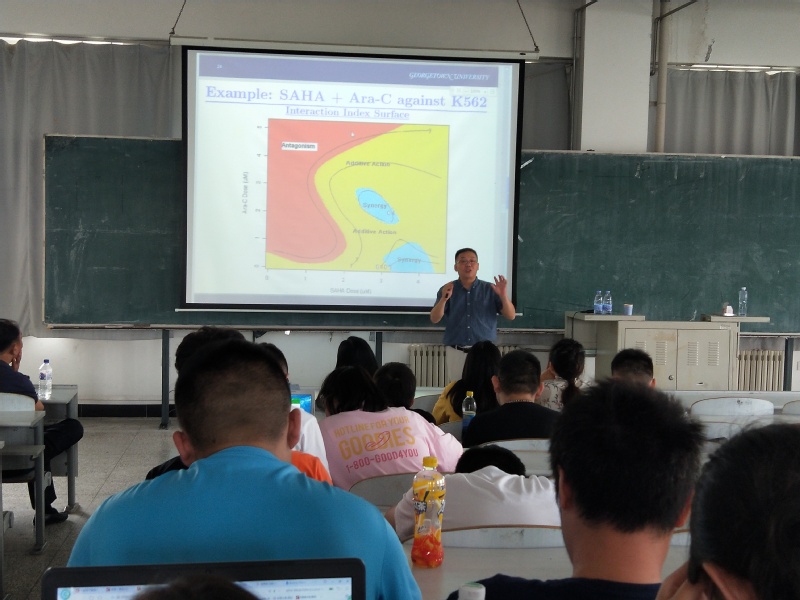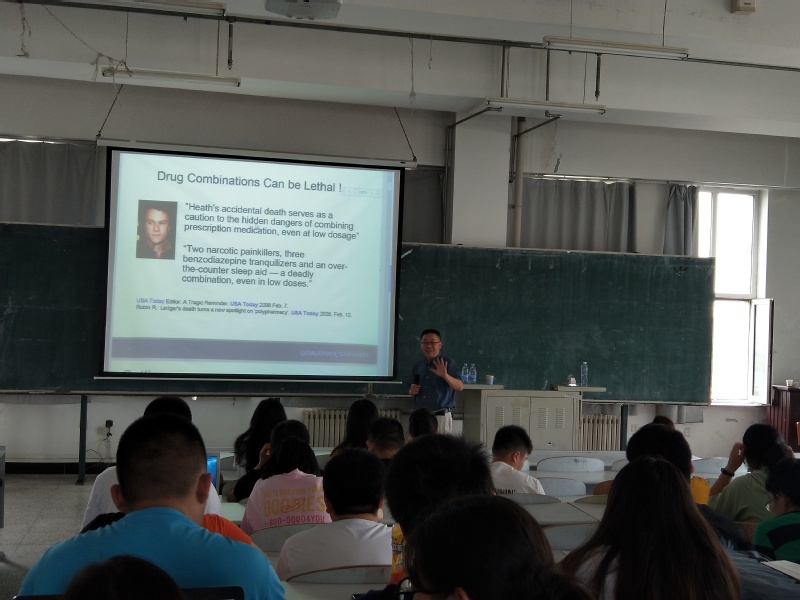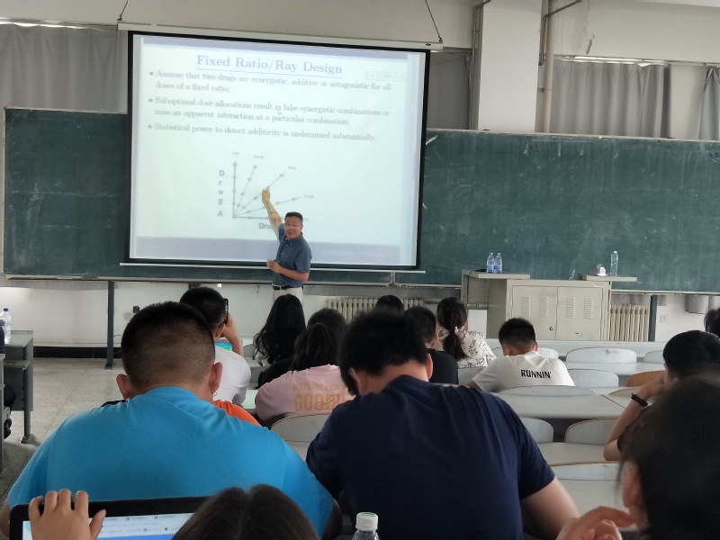 副院长王纯杰先向同学们介绍了方宏彬副教授的个人简历,然后,方宏彬老师简单介绍本人的工作经验,简单介绍了关于肺癌和乳腺癌的一些案例和病例。主题是如何找到新药针对病情。讲述如何去治疗癌症,两种新药针对一种疾病的效果是加和作用还是促进作用,进而了解新药的效果,运用了一些关于数学统计的公式推倒去验证结论;讲述了应该怎么样去做实验去验证结论,清楚的讲述了统计的应用以及大部分人对统计理解的偏差。老师和学生提出提出了一些问题,方洪斌老师都作出了一一解答并且解答的非常详细,使得学生和老师得到了知识的提升,加大了对此方向更深刻的了解。
