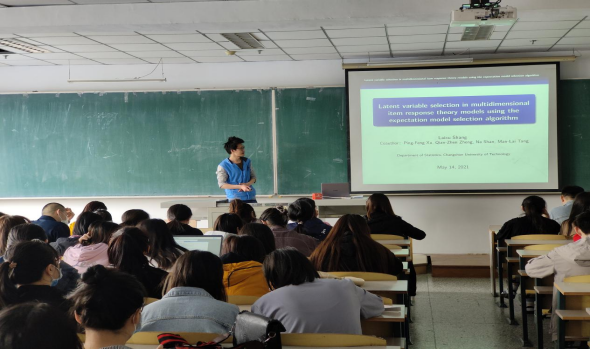 在报告中,我院博士生尚来旭向大家展示了多维项目反应理论模型中潜在变量的选择问题,报告采用到期望模型选择算法,引起同学们的学习兴趣。
