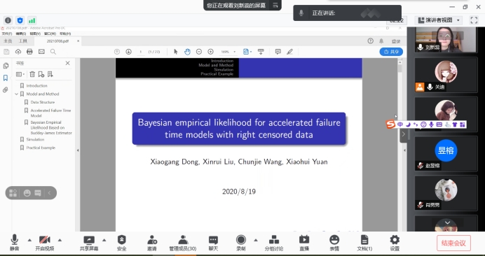 与会人员积极参与讨论,对于刘新蕊博士讲解的右删失数据的贝叶斯经验似然进行了热烈的讨论和交流,刘新蕊博士就提出的问题进行了详细的解答。本次学术交流会使大家深入了解了贝叶斯经验似然及应用,开拓了同学们的视野,聆听报告的研究生均表示受益颇多。