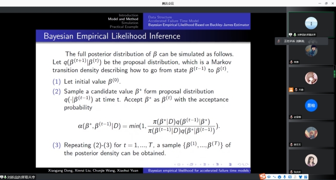 报告会中,刘新蕊博士首先回顾了各个方法的利弊。然后,通过引入先验,在Buckley-James估计的基础上构造了贝叶斯经验似然函数。随后,利用MH算法对贝叶斯经验似然和贝叶斯估计以及B-J估计和经验似然进行了仿真研究。仿真结果表明,贝叶斯经验似然估计比贝叶斯估计、B-J估计和经验似然估计具有更好的实用性能。最后,将该方法应用于实例分析,得到了较窄的模型参数置信区间。使大家对于B-J估计及贝叶斯估计有了更加深入的了解和兴趣。