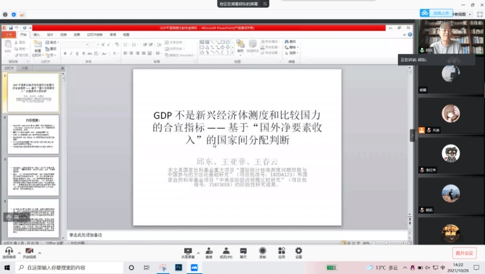 报告会中,邱东教授讲解了1990-2019年30年来“国外净要素收入”在全球各国的分配情况,并进一步说明了美国的NFI盈余占全球40%,占据全球第一,中国的NFI赤字随着GDP增大而急剧快速增大。最后邱老师还讲授了新兴经济体GDP增长与NFI赤字存在加大的剪刀差趋势。