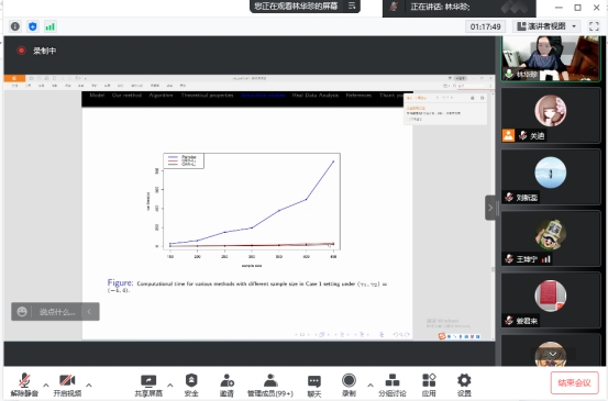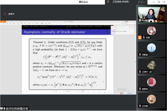 本次报告会的主题是“用于亚组分析的中心增强L2型正则化”,报告会伊始,林华珍老师介绍了亚组分析方法,通过在损失函数中引入群中心和L2型惩罚,提出了一种新的中心增强正则化(CAR)方法。该方法可以被看作是正则化方法和FMM的统一。与现有方法相比,该方法具有更高的效率,更好的稳健性,也更方便计算。特别地,它的计算复杂度从传统的成对惩罚方法的O(n^2)降低到O(nK),其中n是样本大小,K是亚组的数量。建立了CAR的渐近正态性,证明了算法的收敛性。最后老师介绍了也将CAR应用于一个多中心临床试验数据集:丁丙诺啡治疗鸦片依赖。与现有方法相比,得到了更大的R^2,并确定了三个额外的重要变量。