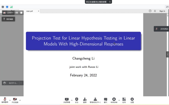 报告中,李长城教授简要介绍了高维因变量线性模型中的线性假设检验问题,以及经典检验方法似然比检验与Hotelling