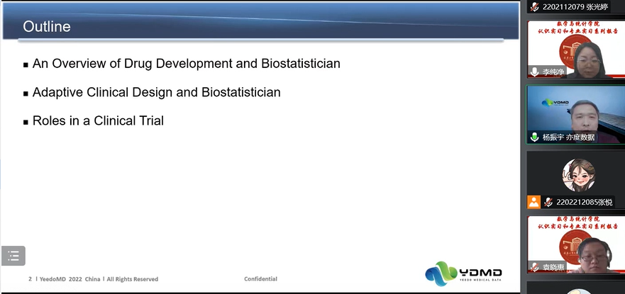 在报告会中,杨振宇老师从药物开发与生物统计概述、适应性临床设计和生物统计学家以及临床试验中的角色三个方面出发,系统地讲述了药物生产的全部流程,以及制药过程中可能会出现的问题。并在此基础上详细地介绍了统计师和编程师在整个药物研发的全周期的工作内容以及工作要求。最后,针对生物统计师的发展前景,对同学们学习能力和知识水平提出要求。