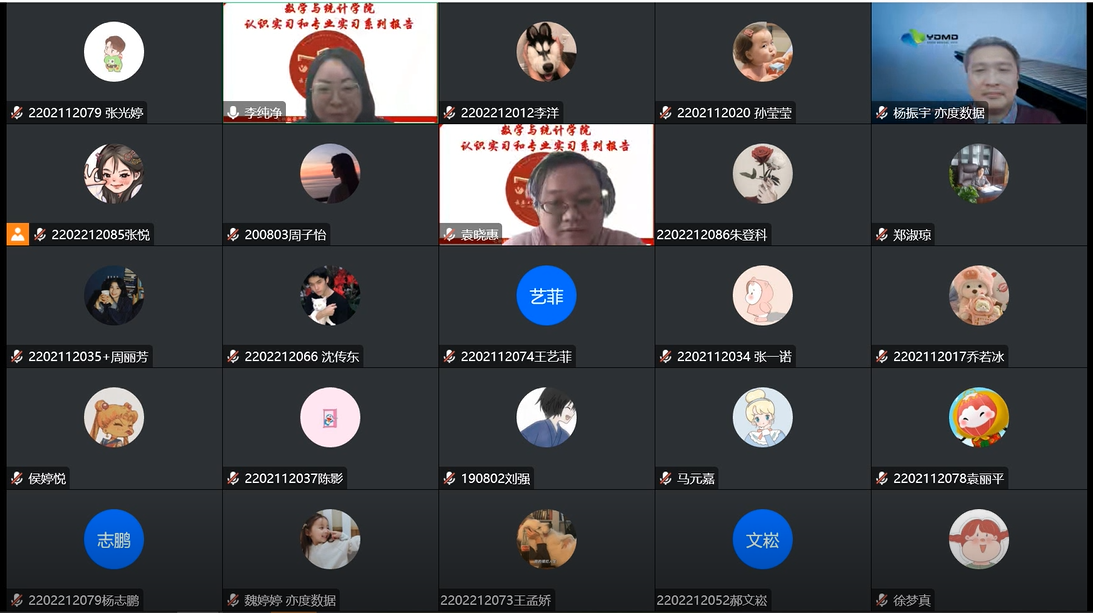 副院长李纯净主持,统计主任杨凯、统计系支部书记袁晓惠,以及统计系胡茜等青年教师以及2020级、2019级本科生以及研究生参加了本次线上报告。