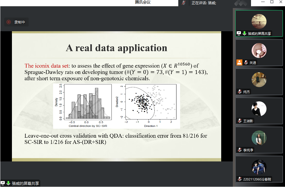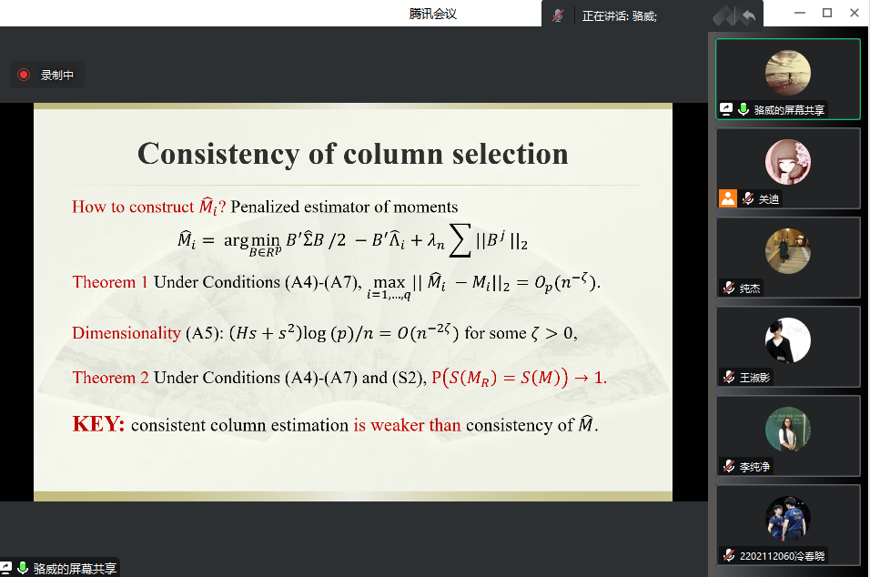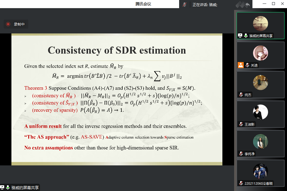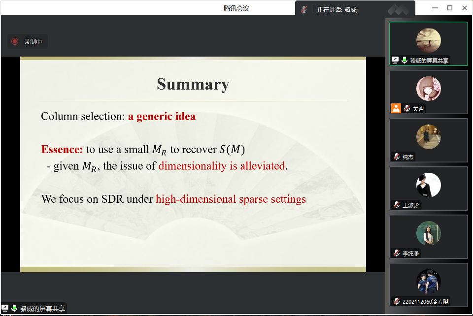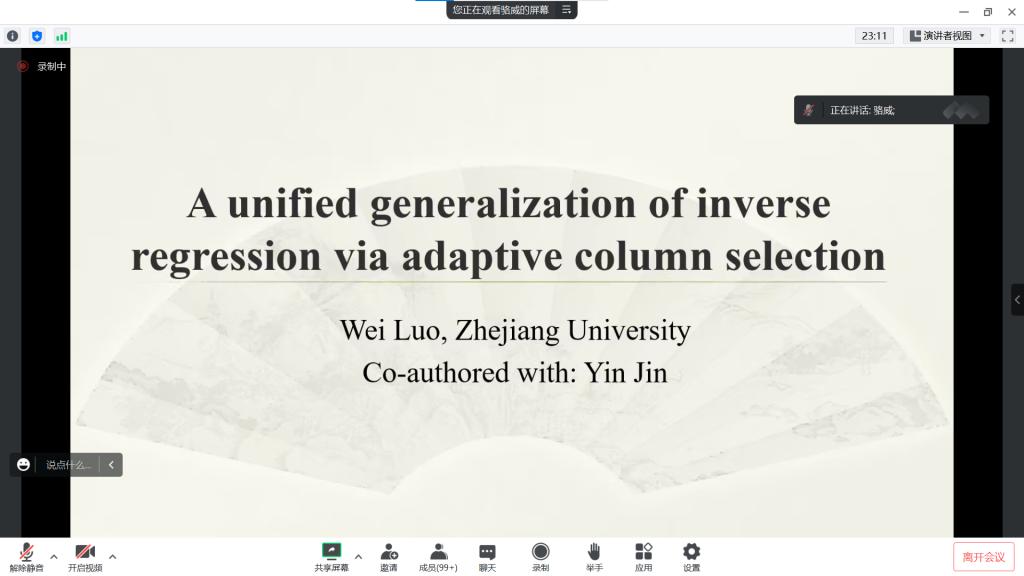 主办的报告——“A unified generalization of inverseregression via adaptive column selection”在腾讯会议线上举行,特别邀请骆威老师作为主讲人,基于骆威老师本人的研究以及工作经历,为我校师生进行讲解,我院共有160多名师生前来参会讨论与学习。我院十大博彩网站排行榜