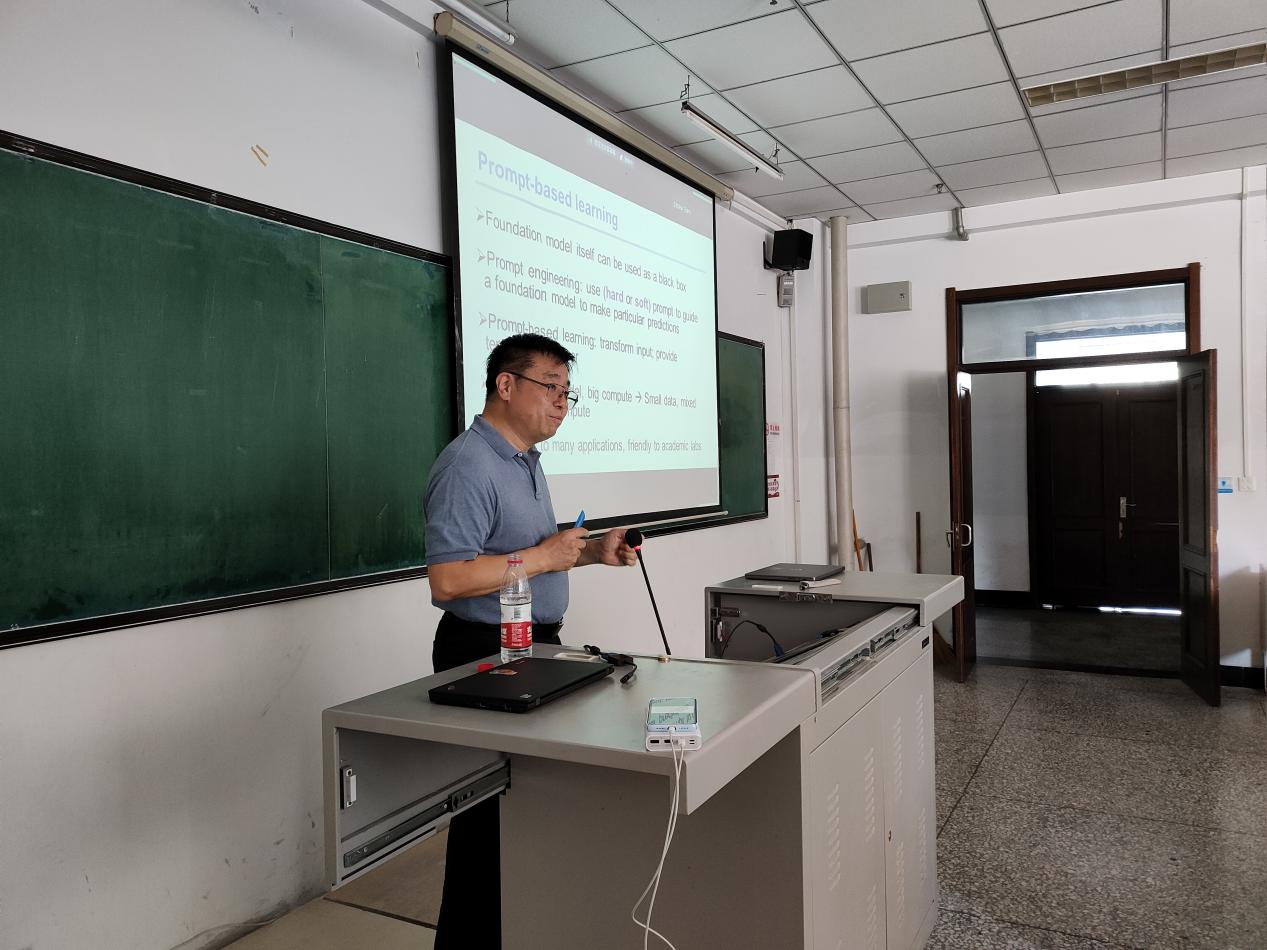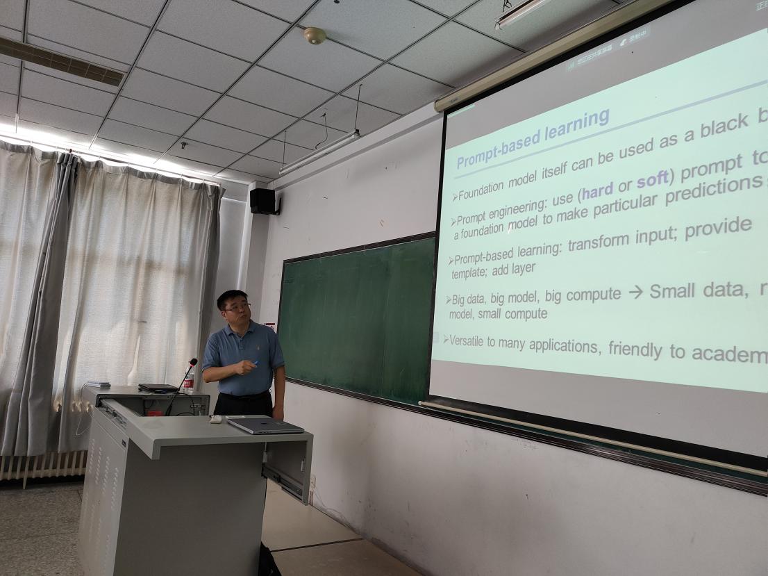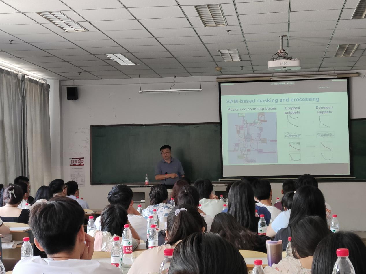 此次学术报告中,旭东教授分别从研究背景、基础模型时代、基于项目的学习、未来工作等方面向同学们讲解有关基于即时学习的生物医学图像和文本分析的相关知识。首先许东教授向同学们介绍了基础模型时代,接着又向同学们介绍了机器学习模式等知识,对于难以理解的知识,许东教授会用同学们熟悉的实例来解释。理论联系实际,让枯燥的知识变得生动起来,同学们理解起来也不再困难。最后许东教授向我们介绍了其团队未来的工作方向和发展趋势。报告结束后,部分同学向许东教授提出了自己不懂的地方,许东教授都一一详细且耐心的给出了答案。