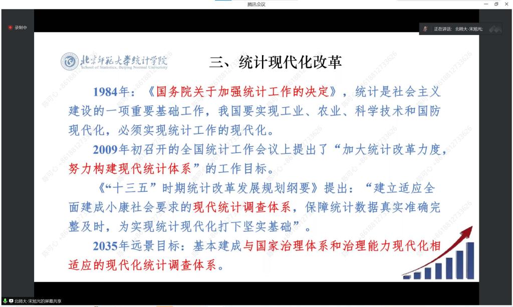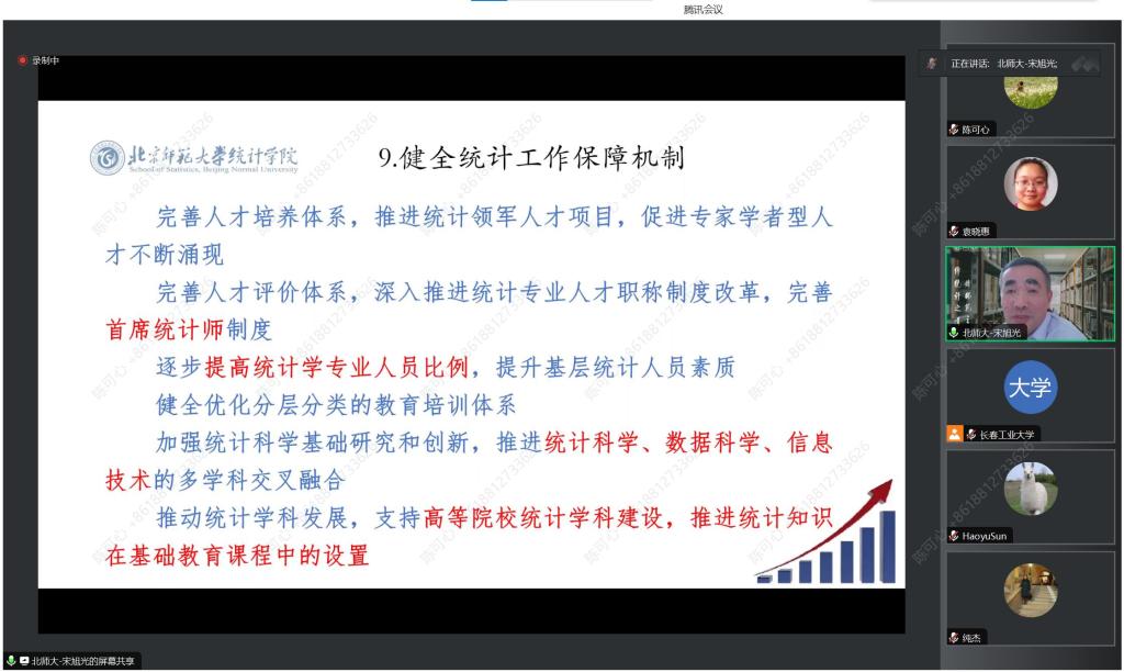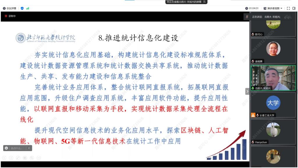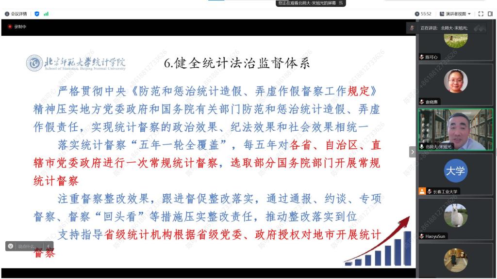 师生介绍了统计现代化改革的各个方面,主要包括统计指标体系,统计调查制度体系,国民经济核算体系,统计监测体系,统计监督体系,统计信息化建设,统计工作保障机制等方面。在统计体系建设方面,统计部门与其他政府部门之间要紧密联系,相互交流,防止数据孤岛问题,同时要更新数据收集体系,实现统计数据报采集处理的全面在线化;在行政监督方面,要严格贯彻中央《防范和惩治统计造假、弄虚作假督查工作规定》,执行好统计督察工作,保证数据质量。