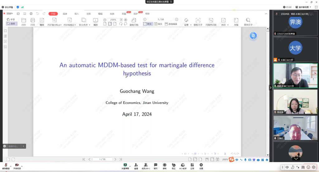 报告会中,王教授主要介绍了关于鞅差序列的检验问题。王教授主要侧重于在具有参数条件均值的多元时间序列模型中,关于检验误差项是否为边际差序列(MDS)的问题。基于MDDM的检验是检验多元时间序列模型中 MDS 的一种有效统计方法,但基于 MDDM 的检验应指定滞后期的数量。故为解决这个问题,有一种基于数据驱动的 MDDM 检验,可以自动选择滞后期。该检验有两个优点:首先,无需指定滞后期;其次,在零假设下滞后期等于 1,节省大量计算成本。