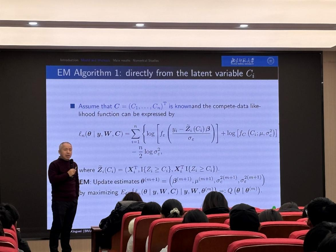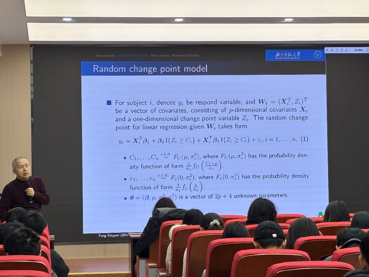 童教授先是分享了读书的经验、工作的经历以及自己所创的工作。同学们认真聆听,受益匪浅。紧接着,童教授以举例子的方式切入本次报告的主题——随机变点。在修路的过程中会遇到山川、河流、土坑等等一系列不确定的因素,为了使修路的资金最小化,就需要在这些不确定因素下进行不同的处理。这就是随机变点的概念。