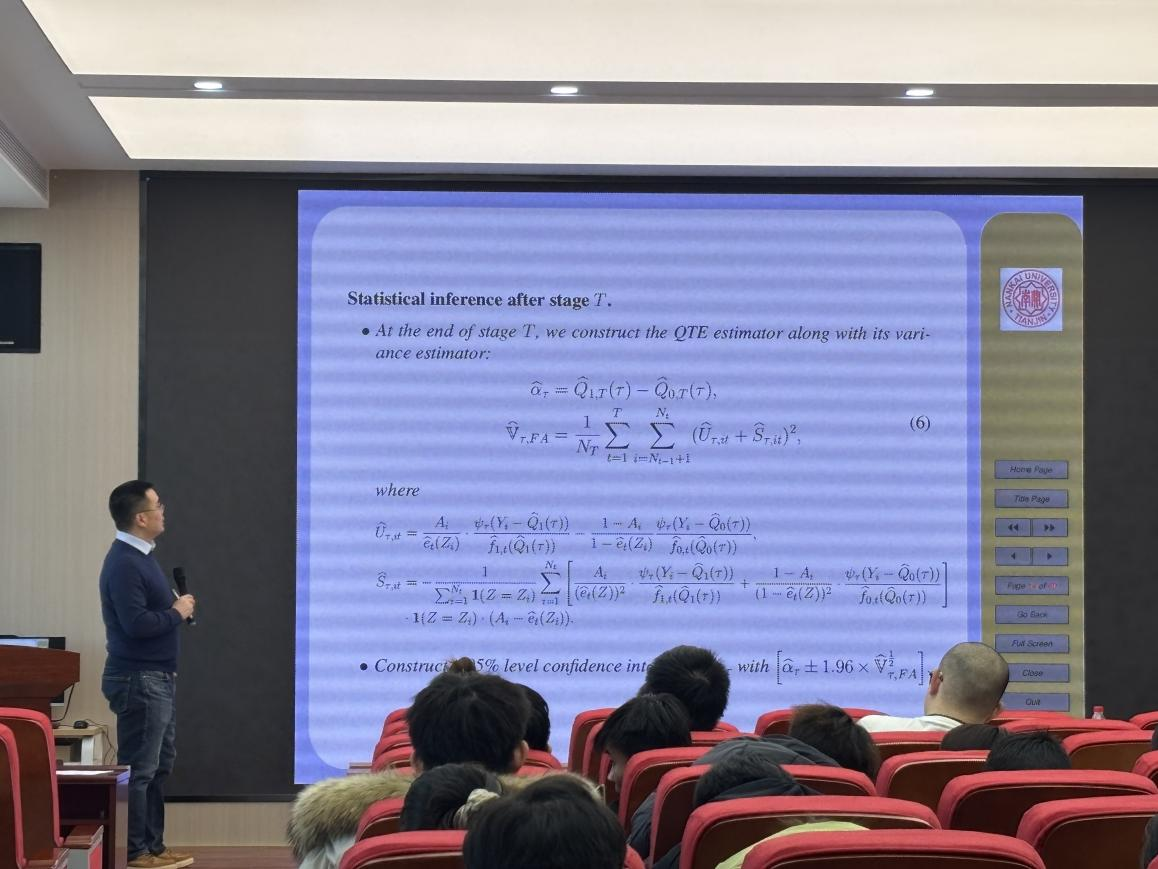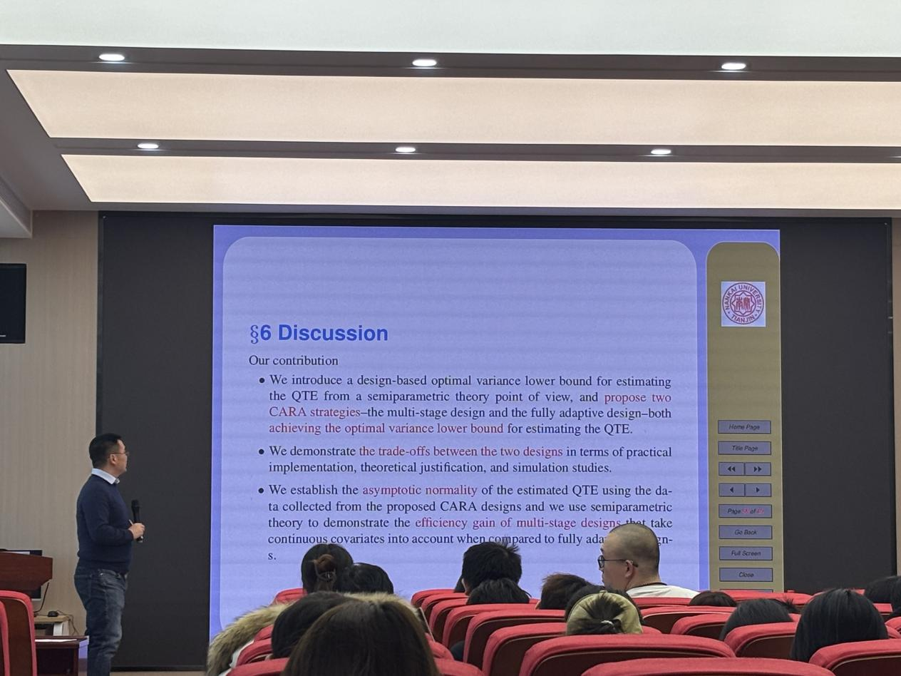 报告摘要:In program evaluation studies, understanding the heterogeneous distributional impacts of a program beyond the average effect is crucial. Quantile treatment effect (QTE) provides a natural measure to capture such heterogeneity. While much of the existing work for estimating QTE has focused on analyzing observational data based on untestable causal assumptions, little work has gone into designing randomized experiments specifically for estimating QTE. In this talk, we propose two covariate-adjusted response adaptive design strategies--fully adaptive designs and multi-stage designs--to efficiently estimate the QTE. We demonstrate that the QTE estimator obtained from our designs attains the optimal variance lower bound from a semiparametric theory perspective, which does not impose any parametric assumptions on underlying data distributions. Moreover, we show that using continuous covariates in multi-stage designs can improve the precision of the estimated QTE compared to the classical fully adaptive setting. We illustrate the finite-sample performance of our designs through Monte Carlo experiments and one synthetic case study on charitable giving. Our proposed designs offer a new approach to conducting randomized experiments to estimate QTE, which can have important implications for policy and program evaluation.