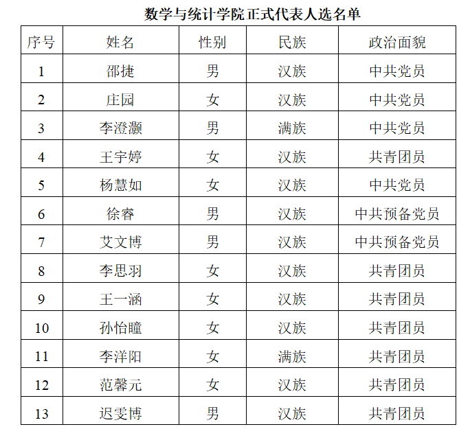 根据《共青团长春工业大学第二次代表大会代表选举工作办法》,经十大博彩网站排行榜 团员大会差额选举,现将十大博彩网站排行榜 团委选举产生的共青团长春工业大学第二次代表大会正式代表人选进行公示: