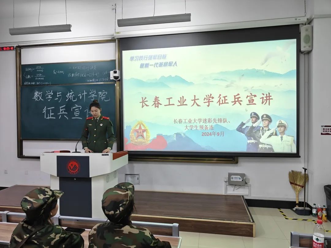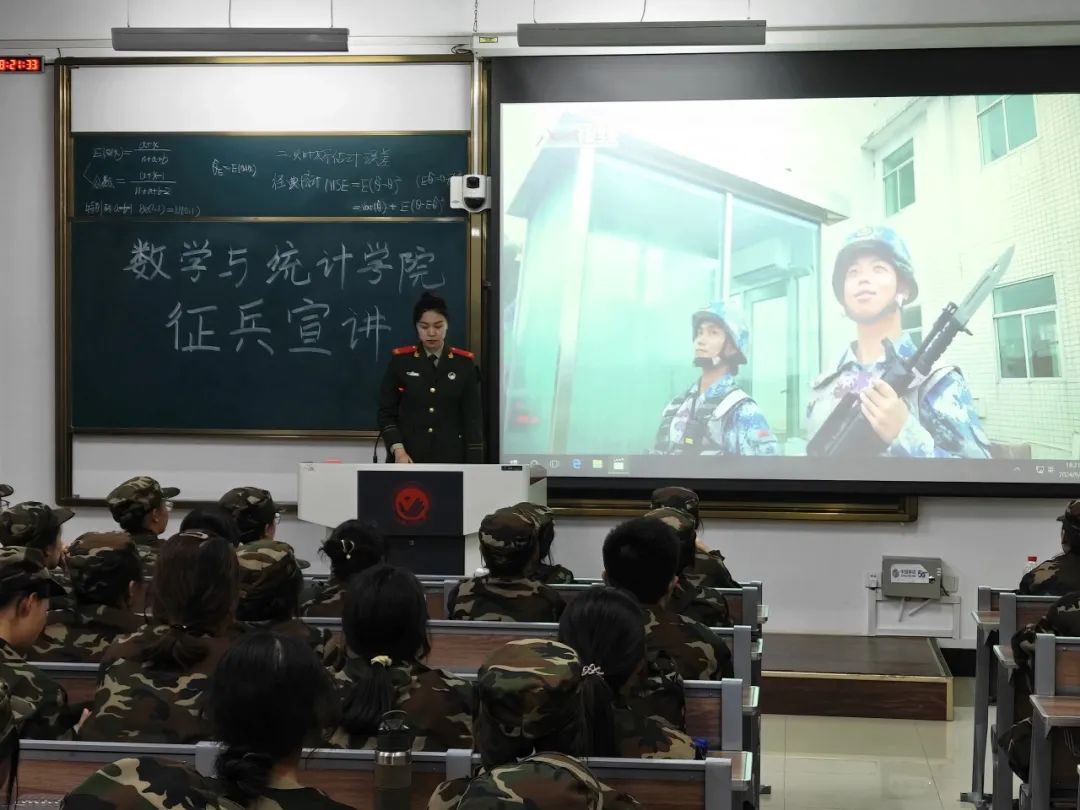 于2024年9月10日下午在主楼215及223教室隆重举行了以“携笔从戎,报效祖国”为主题的征兵宣讲会,全体新生参与本次会议。