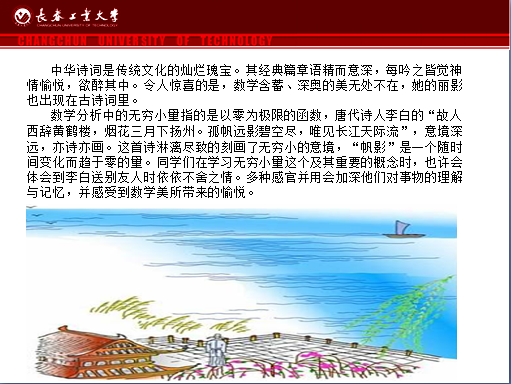白琪峰老师在勾股定理的讲授中,指出中国的定理得出比西方早了500多年,旨在激发同学们的爱国情怀和为中华民族伟大复兴作出贡献的热情。黎海彤老师将《数学分析》中的无穷小量与古诗“孤帆远影碧空尽”中的“帆”“影”相联系,体现了中国古代人的智慧与文学素养,利用多种感官加深学生对事物的理解和记忆。