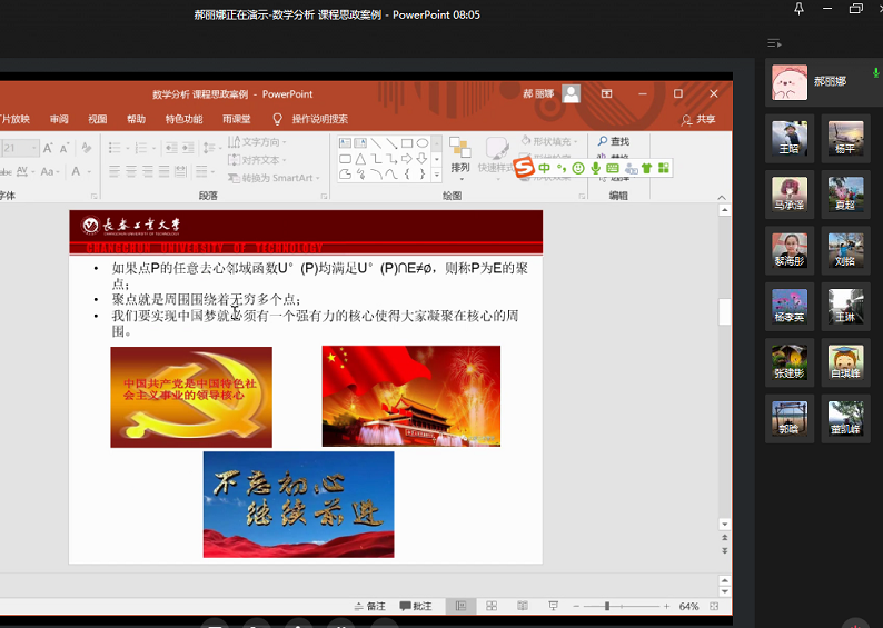 其次,每位参会的老师都讲解了自己的思政教学典型案例,例如:杨平老师将《数据科学导论》中聚类的概念与中国古语“物以类聚、人以群分”相对应,教导学生探究事物的本质,注重事物的主要矛盾。郝丽娜老师将《数学分析》中聚点的概念与中国人民紧密团结在中国共产党的周围相联系,指出要实现中国梦就要有强有力的核心使得大家凝聚起来。
