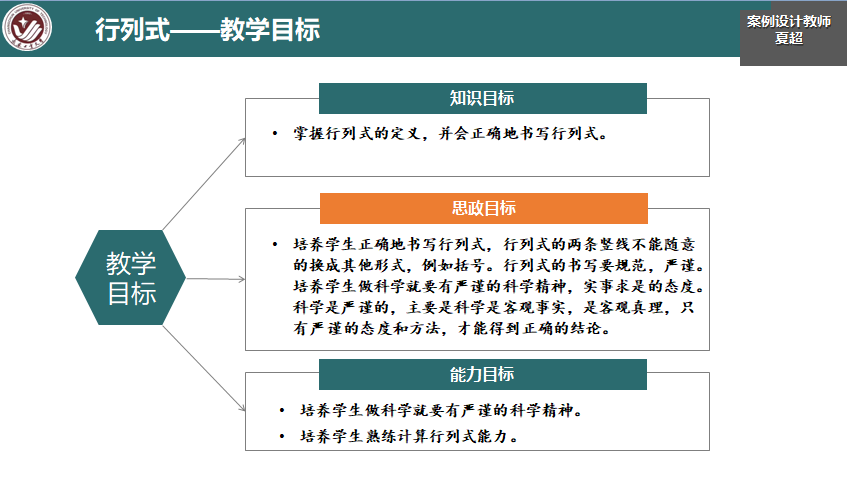 郭晗老师在讲授线性代数课程时,希望同学们能够从马克思主义哲学思想出发,学习课程中“变与不变”,“量变与质变”的辩证关系。杨孝英老师讲授的《数值分析》是一门理论与实践结合非常紧密的学科,希望学生们提高理论联系实际的能力。夏超老师的行列式计算与“失之毫厘谬以千里”相对应,意在倡导学生要具有严谨的科学精神,实事求是的态度。