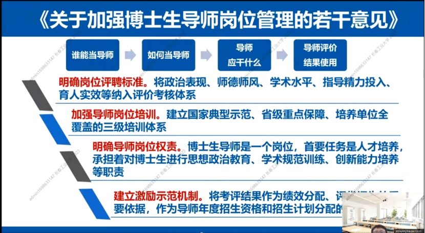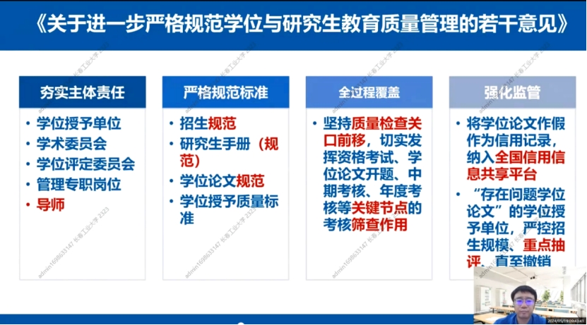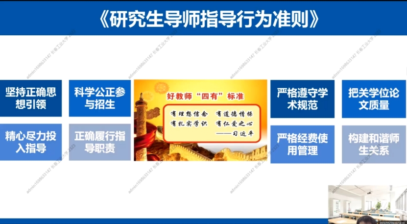 (通讯员:关迪)为贯彻落实习近平总书记关于研究生教育工作的重要指示精神,落实研究生导师立德树人根本任务,提升研究生导师教书育人能力素质,切实保障我校研究生培养质量,促进学校研究生教育事业高质量发展。根据《教育部关于全面落实研究生导师立德树人职责的意见》(教研〔20181号)、《长春工业大学研究生指导教师培训管理办法》(研字〔20227号)等文件精神,十大博彩网站排行榜 于2024519日上午830分,第二期培训班在线上如期举行,十大博彩网站排行榜 副院长杨凯副教授主持会议,十大博彩网站排行榜 全体研究生指导教师参加了本次培训。本次培训由清华大学王传毅老师讲述面向新时代的中国研究生教育改革:近三年研究生教育重大改革政策解读。