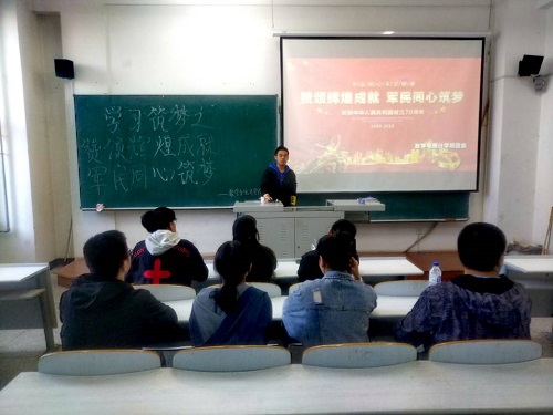 团委在教图楼111室举办“学习筑梦”系列活动之“赞颂辉煌成就,军民同心筑梦”。此次学习由180801班团支书闫新洋主讲,大二各团支部的委员们参加了本次学习活动。